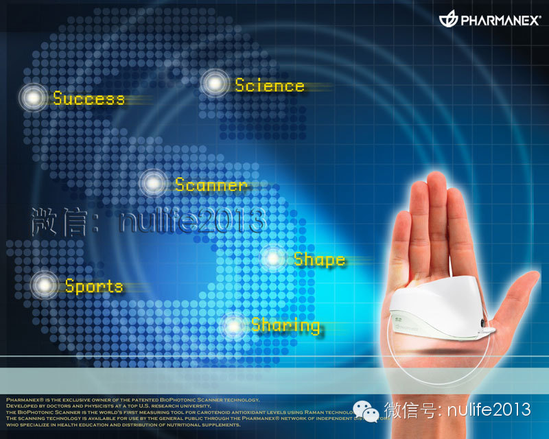 生物光子掃描儀耗資7,000 萬美元(約5.6 億元人民幣),利用曾於1930 年榮獲諾貝爾物理獎之生物光子科技—— 拉曼共振光譜法的原理,研發出首部以快捷及無創的生物光學科技應用於營養學上的儀器—— 生物光子掃描儀。生物光子掃描儀利用光學信號,在不受其他分子物質乾擾下,辨識類胡蘿蔔素的獨特分子結構。只需把手掌心放在掃描儀的鏡頭前,便可於短短兩分鐘,即時度量出人體內類胡蘿蔔素抗氧化劑的含量——“ 身體類胡蘿蔔素指數” 。NU SKIN 如新擁有此項技術的全球專利長達20 年,於世界建立空前的優勢。