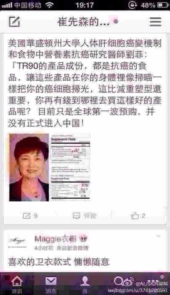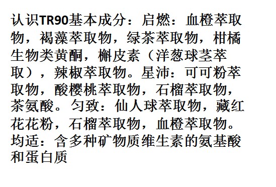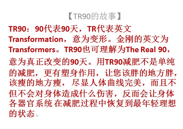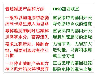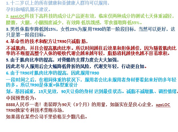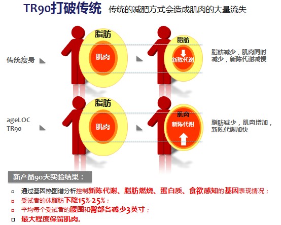 為什麼TR90敢說顛覆減重市場的格局?底氣來自於強大的高達ageloc5億多組的基因數據庫的支持,這個數據庫來源於兩次發表在世界頂尖的科學雜誌《Science》的<熱量限制實驗>,這個實驗累積了恒河猴長達30年的,從幼年到老年的全部基因表達數據,是世界上唯一的長達30年的靈長類動物基因數據庫。這30年的時間是其他任何公司都無法跨越的距離。正是因為這個龐大的、無法跨越的基因數據庫,吸引了世界著名的以報導全球尖端科技及最前沿技術著稱的《Discovery》來Nuskin公司專訪ageloc科技,製作了《人類基因解碼》在全球播放。也正是這個ageloc技術,世界四大財經雜誌之一《福布斯》在2013年2月7日推薦如新的股票為2013年最具投資價值第一名。TR90脫胎於ageloc技術平台,TR90是這個平台的第五款產品,也是最大商機的產品。